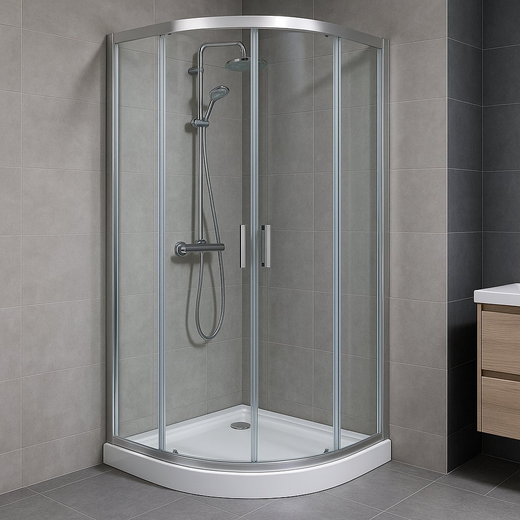 Якісні душові кабіни зазвичай виготовляють із загартованого скла товщиною 5–8 мм, що гарантує міцність і безпеку. Профіль може бути хромованим або алюмінієвим — обидва варіанти добре захищені від вологи й корозії.