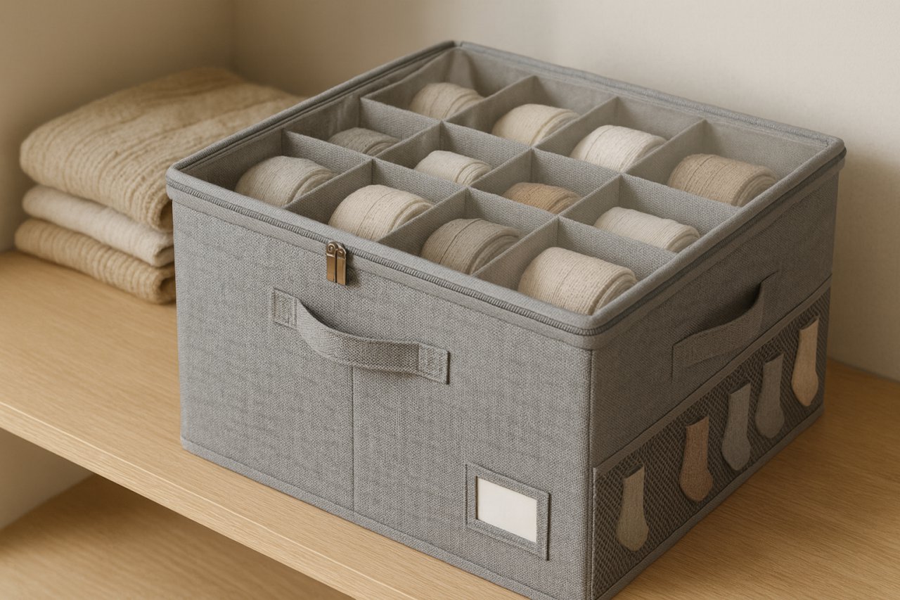 Прозрачные короба с фронтальной дверцей дают быстрый доступ и защищают от пыли. Добавьте кремниевые осушители и расставьте пары по цвету/сезону — так легче поддерживать порядок и планировать ротацию.