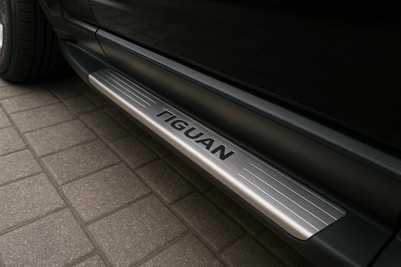 Накладки на пороги — це спеціальні декоративно-захисні елементи, призначені для запобігання пошкодженням кузова автомобіля. Для Volkswagen Tiguan такі аксесуари не лише зберігають охайний вигляд порогів, а й додають автомобілю більш елегантного, завершеного вигляду. Під час посадки та висадки пасажирів часто з'являються подряпини, сколи й потертості — саме накладки допомагають цього уникнути.