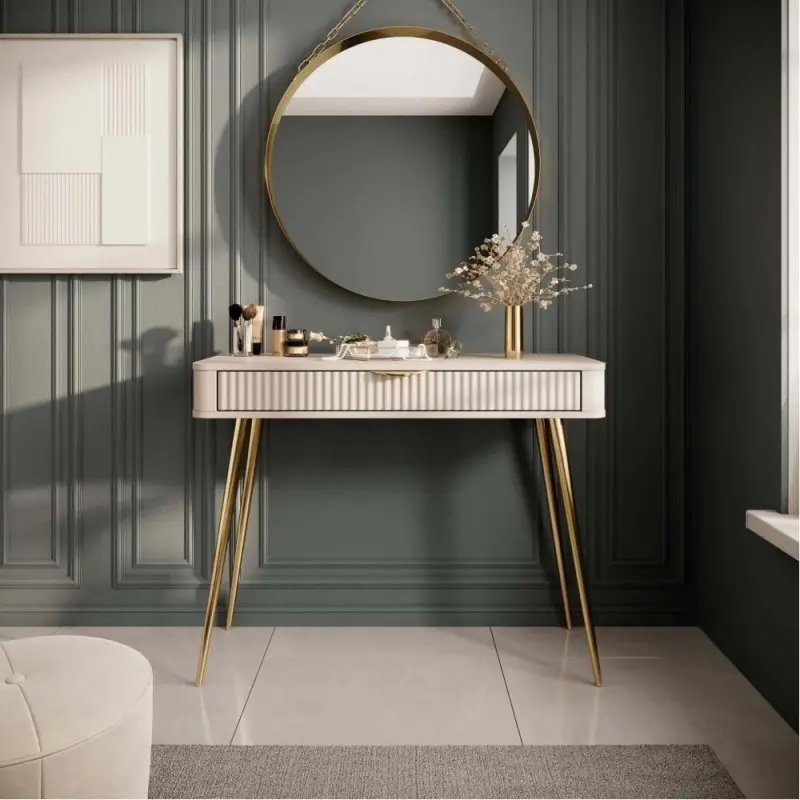 Якщо спальня невелика, обирайте компактне трюмо з вузькими ніжками. Для просторої кімнати — варіант із великим дзеркалом і широкою стільницею. У парі з приліжковою тумбою та сучасним комодом у спальню воно створює цілісний ансамбль.