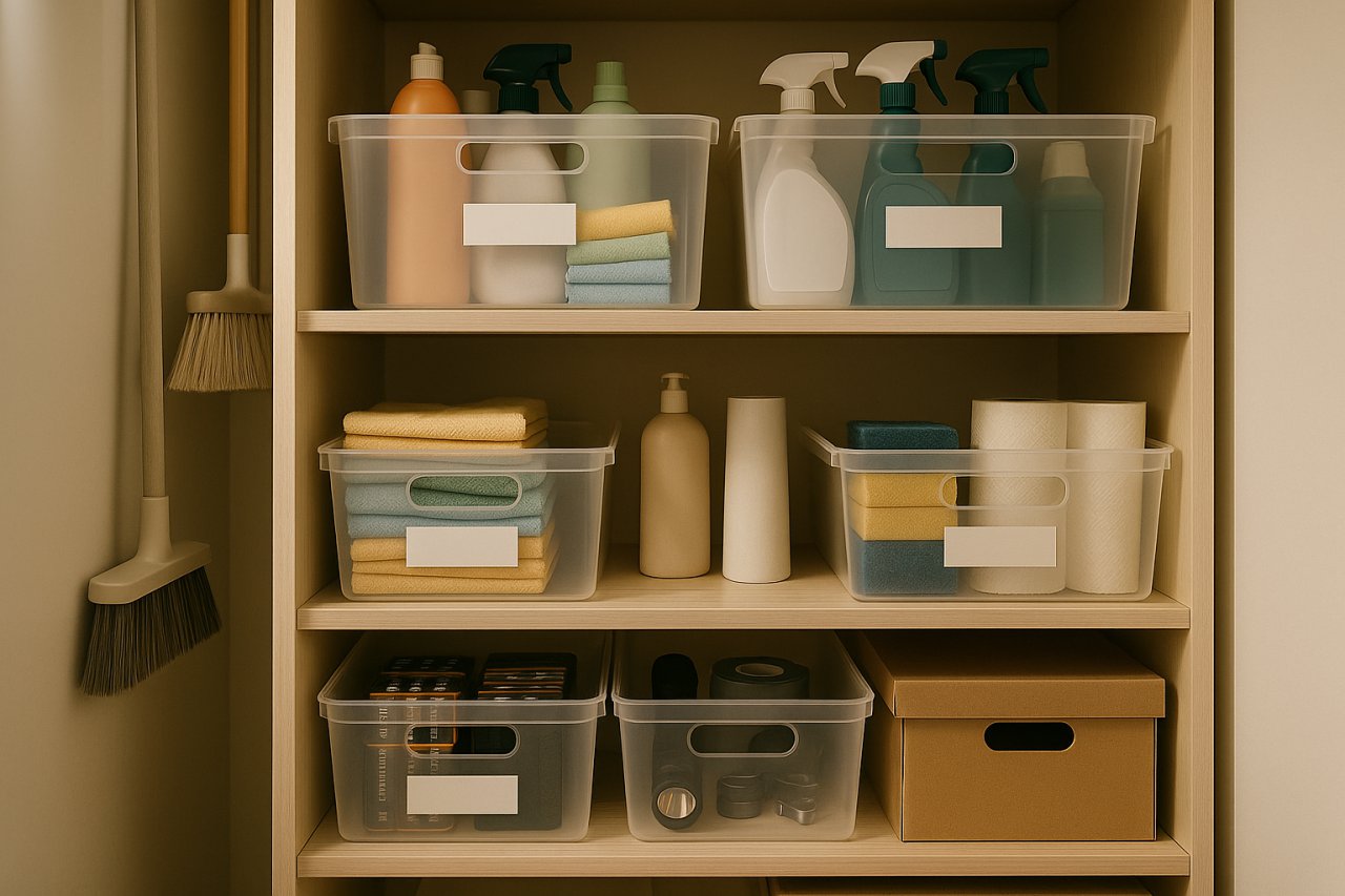 Оберіть сухе місце без перепадів температур. Прозорі бокси допомагають бачити залишки; категорії розводьте по полицях: "Прибирання", "Прання/ПММ", "Кухня", "Ремонт/електрика", "Безпека", "Аптечка". Метод "один працює — один у запасі" простий: відкрили останню пачку — одразу додали пункт у нотатки. Раз на місяць робіть короткий аудит — це займає 10 хвилин.