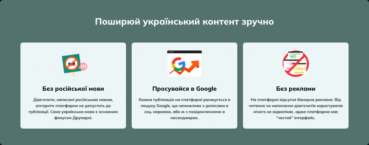 Мовна політика Друкарні — це не лише технічна вимога, а культурний вибір. На платформі не допускається публікація російською мовою. Це обмеження є гарантією того, що кожен авторський блог, написаний тут, додає ваги українському контенту в глобальному Інтернеті.