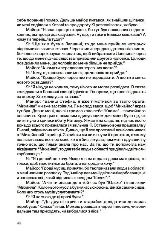 Зіткнення розвідок: Свідчення про те, як підпілля вело контррозвідку. Ключовим моментом є розповідь майора про знайдену в криївці загиблу Марію Римик "Наталку" та її власноруч написаний звіт. У розмові майор Швець фактично зізнається у застосуванні тортур до "Наталки" під час її попереднього арешту ("як я її бив"), проте констатує свій повний професійний фіаско: зв'язкова Шухевича не лише не зламалася, а перетворила перенесене на надважливі розвідувальні дані для Служби Безпеки ОУН.