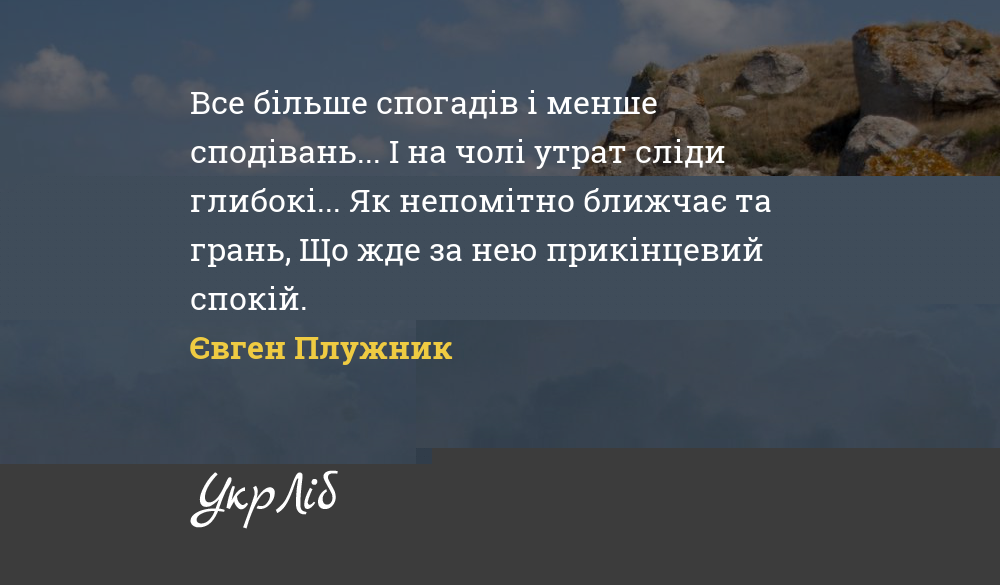 Все більше спогадів і менше сподівань... І на чолі утрат сліди глибокі... Як непомітно ближчає та грань, Що жде за нею прикінцевий спокій.